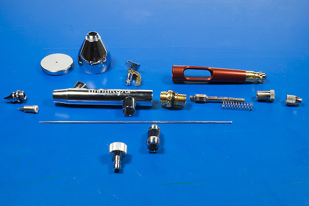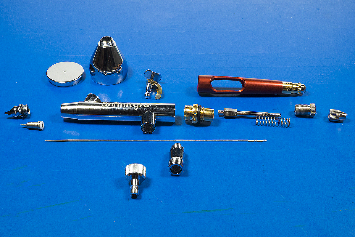 Well, besides the ultra-shiny finish and gold plating, the main difference is in the trigger mechanism that is unique to H&S. In the cutout of the red anodized rear handle you will find two screws, one is obviously a needle nut screw and the tension nut. With the tension nut you can adjust the resistance of the spring in the trigger mechanism. It doesn’t sound special, but believe me; you will be thankful for this feature when you will go for a long airbrush session.